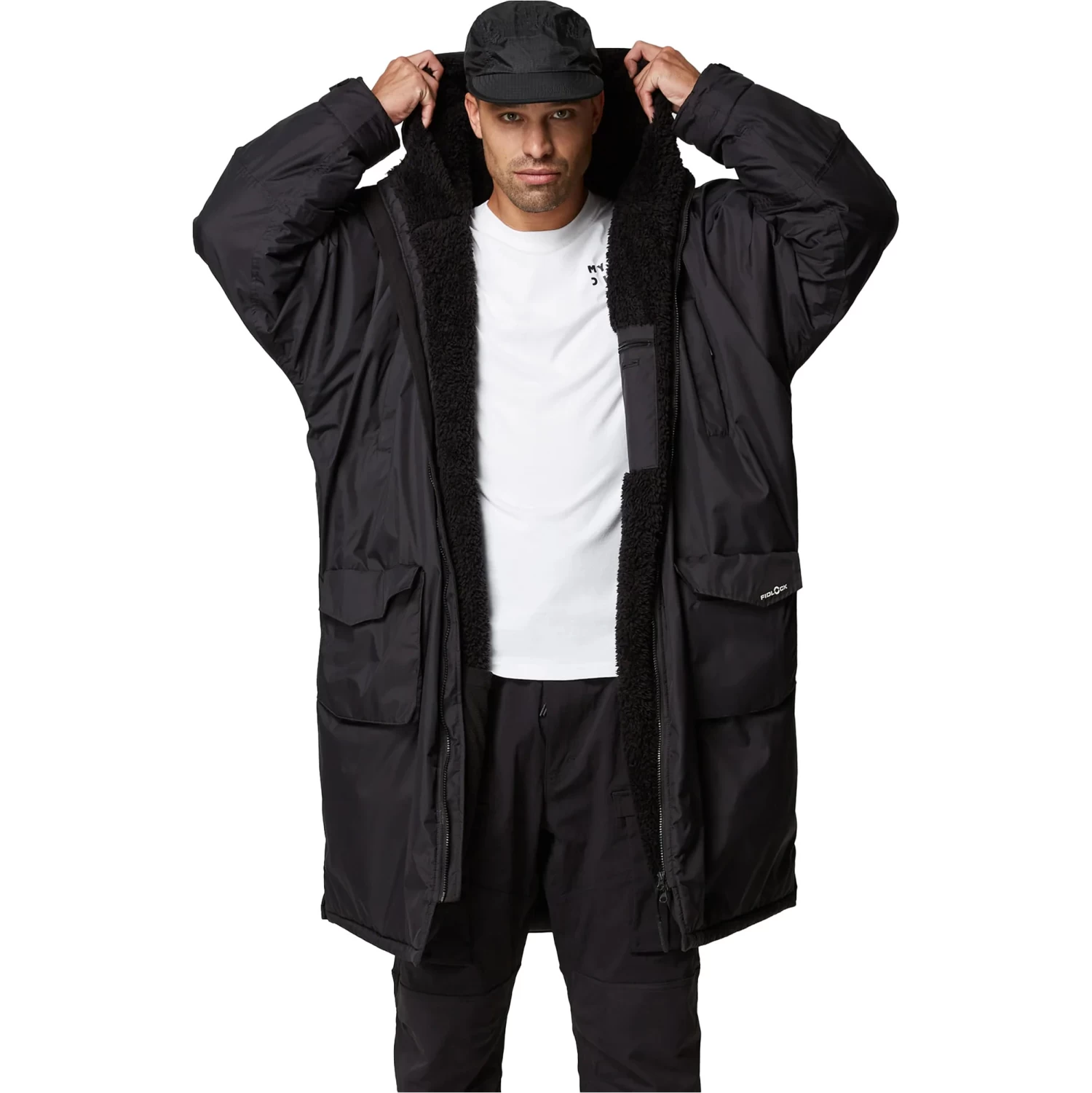 - Fidlock waterproof pocket in wearer’s left hand pocket