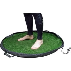 The bag folds out into a flat 1m diameter changing mat for standing on while changing, with pull up drawstrings to cinch the mat together to create a bag with handles for storing and carrying your wet kit and neatly packing it away.