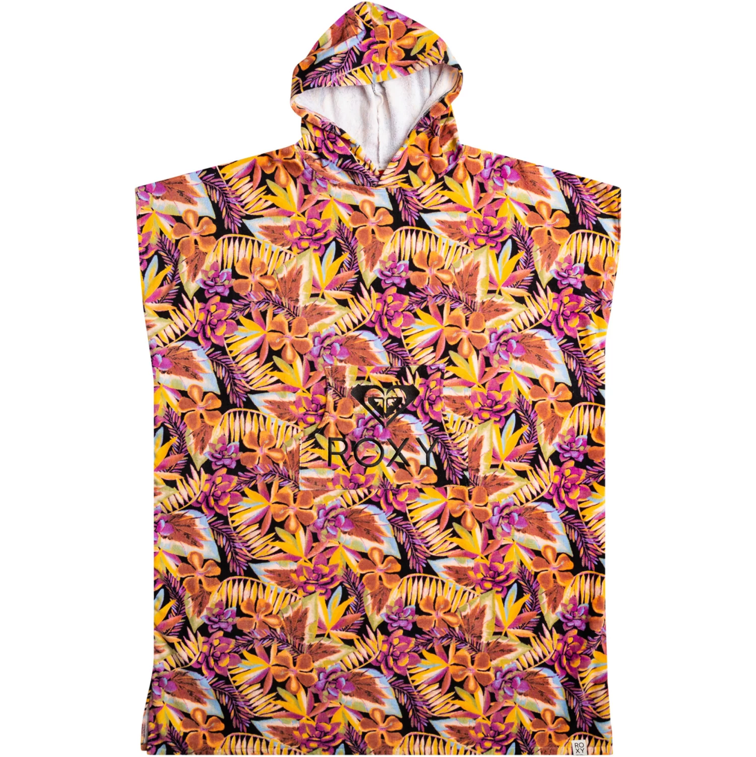 Warm up post-surf in this cozy poncho towel made of printed terry cotton. Complete with a kangaroo pouch pocket, plus ROXY artwork and embroidery.